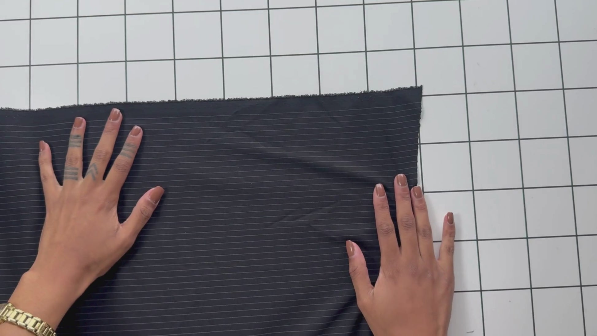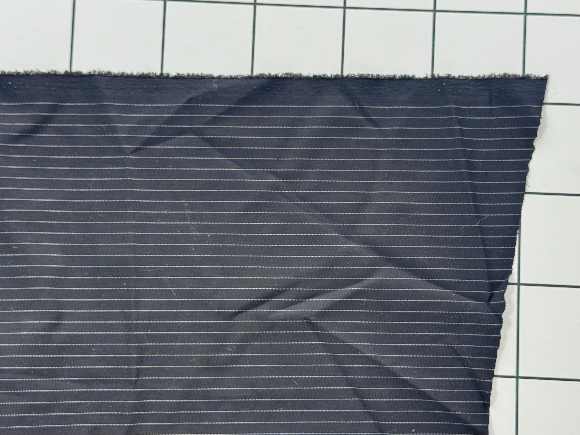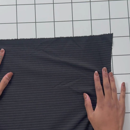 Classic black suiting fabric with fine white pinstripes running evenly across the surface. This medium-weight woven fabric has a smooth hand and structured drape, perfect for tailoring. Its timeless pinstripe design makes it a versatile choice for professional attire and elevated fashion pieces.