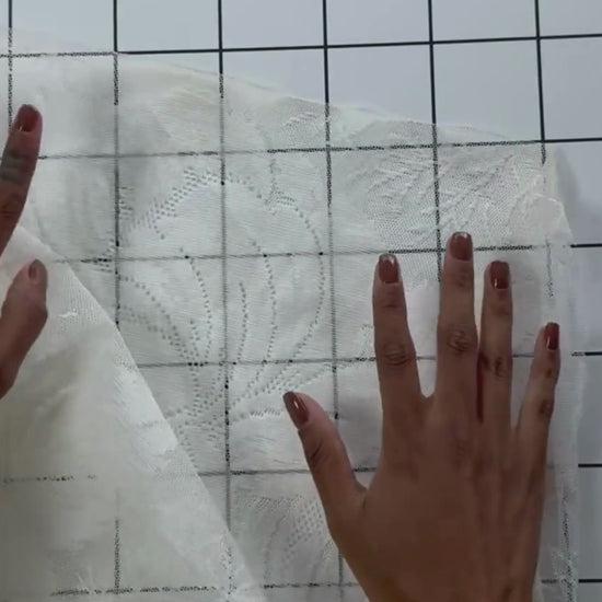 This ivory lace net fabric features a bold woven floral design on a sheer, open net base. With its slightly structured hand and textured finish, it’s perfect for both apparel accents and decorative projects. The fabric has a vintage-inspired look, reminiscent of heirloom lace tablecloths, but versatile enough for modern design.
