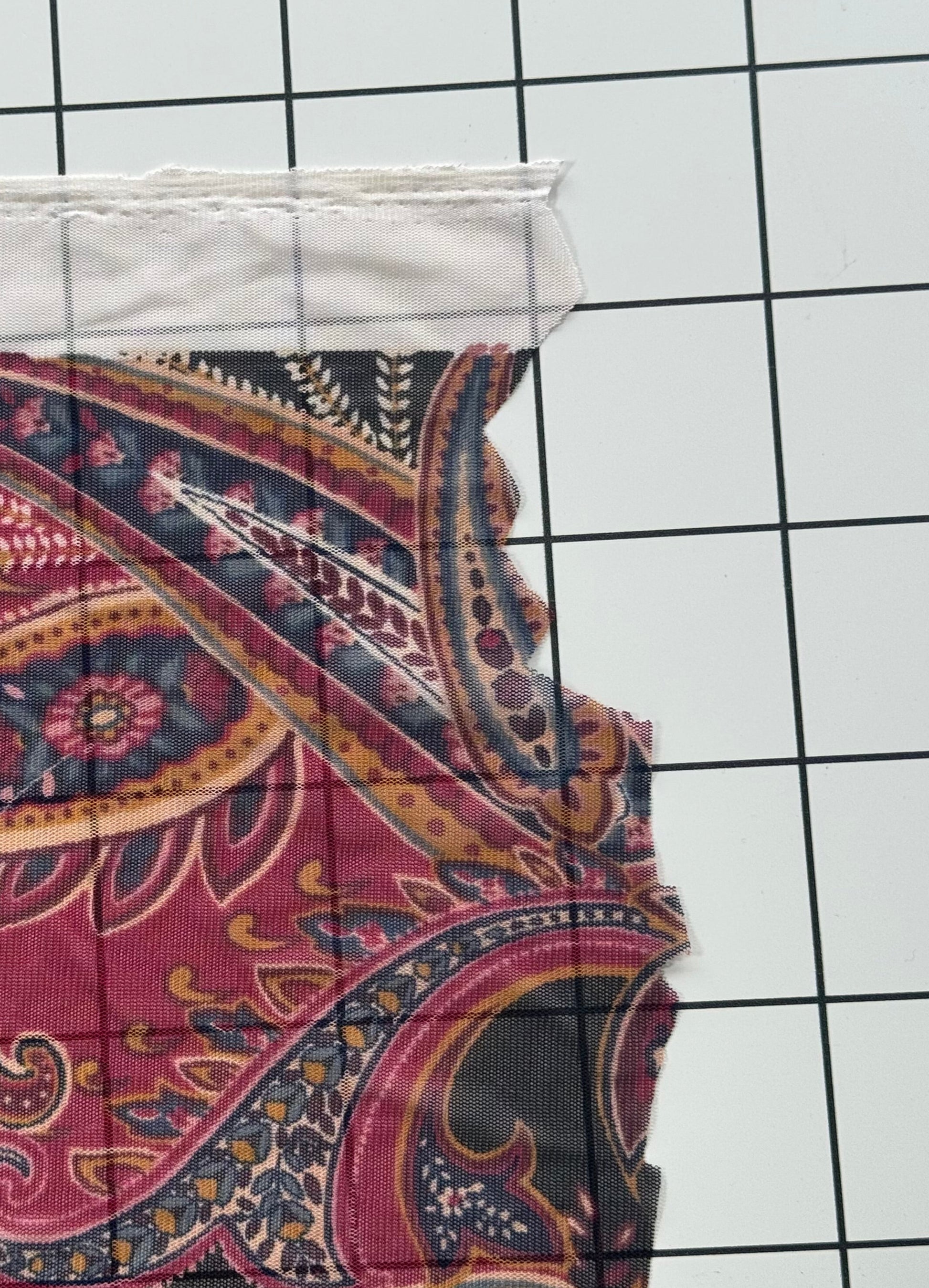 Lightweight mesh fabric featuring a bold paisley print in rich tones of burgundy, mustard, navy, and black. This fabric has a soft hand with stretch, making it comfortable to wear and versatile for layering. Sheer yet strong, it’s an ideal choice for statement garments, overlays, and creative projects that call for both texture and movement.